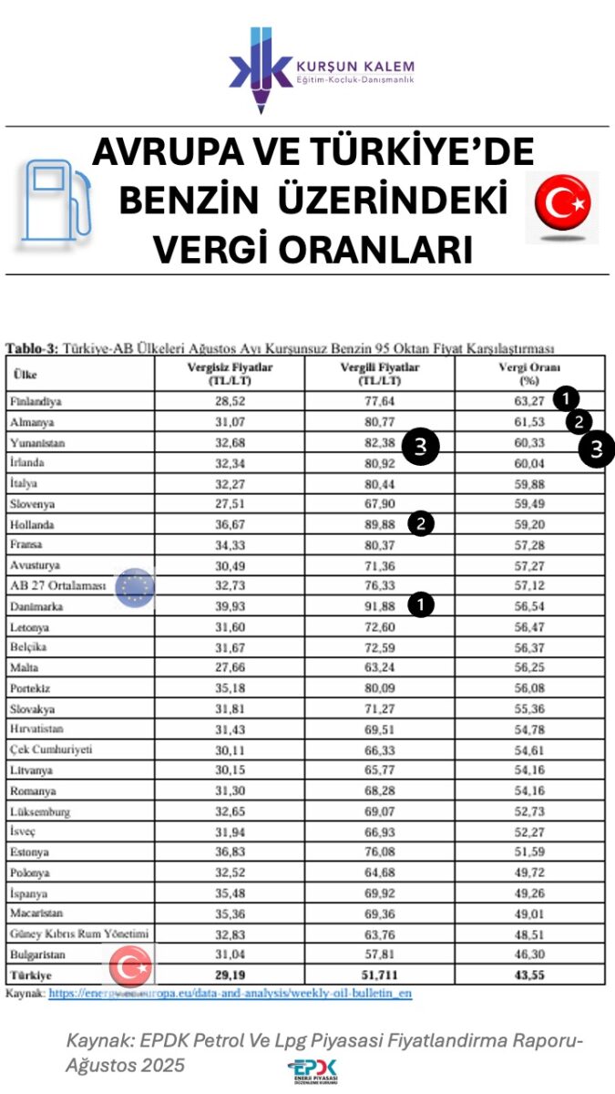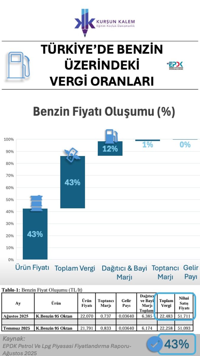 25/10/2025📑 EPDK Ağustos 2025 Petrol ve LPG Piyasası Fiyatlandırma Raporu’na göre ülkemizde en yaygın satılan Kurşunsuz Benzin 95 Oktan’ın fiyat oluşumu: