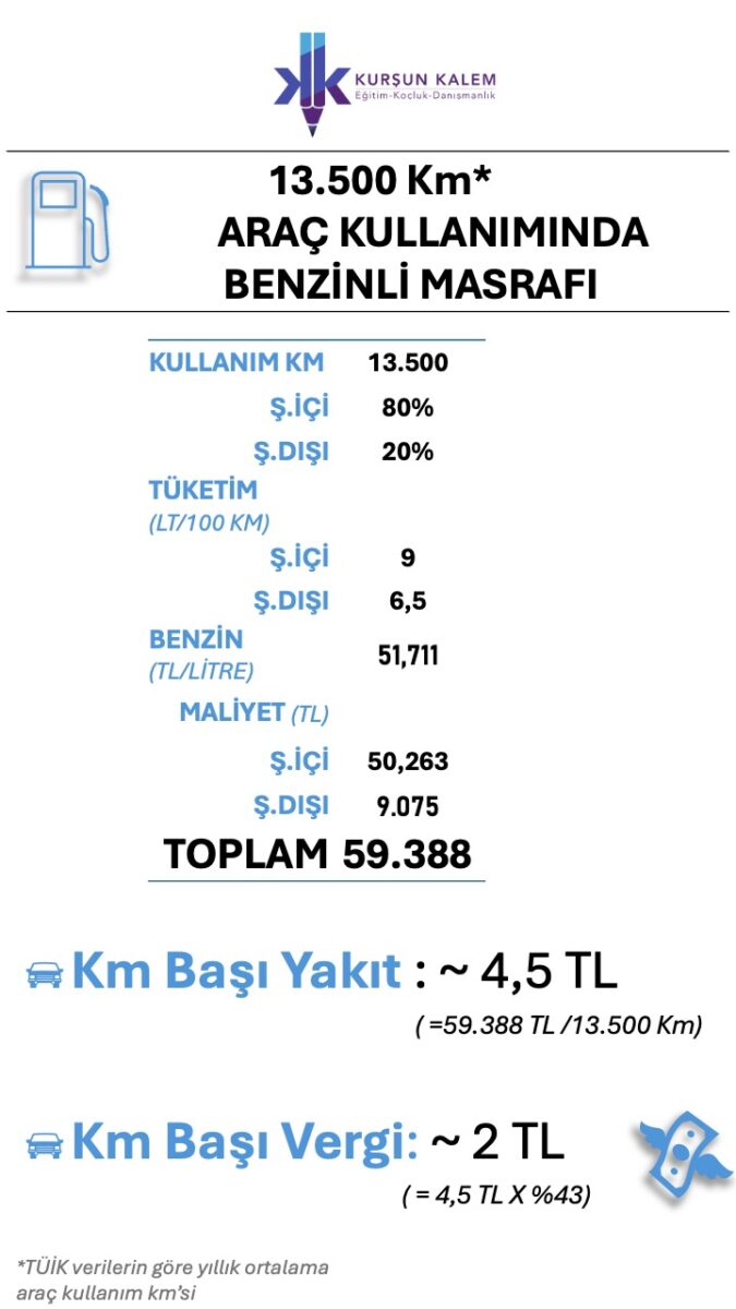 Km başı yaklaşık 4,5 TL yakıt harcanırken bunun yaklaşık 2TL’si vergi olarak ödeniyor. (Şehir için %80, şehir dışı %20 kullanım ile Eylül İstanbul Avrupa Yakası Benzin fiyatlarına göre)