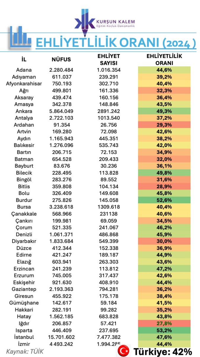 🔹 Ehliyetlilik oranında büyük illerdeki durum (2024):