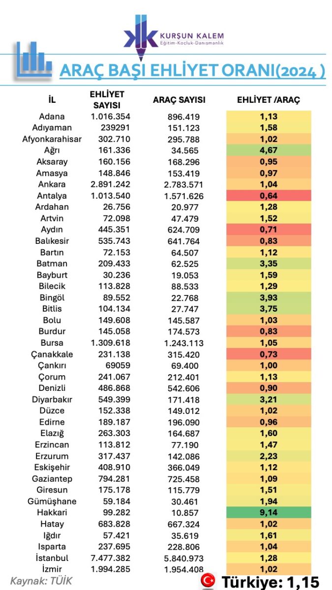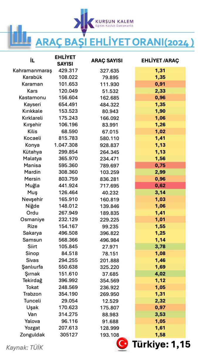 •2024:1,15 –> Yani her 7 araca 8 ehliyet düşüyor!
