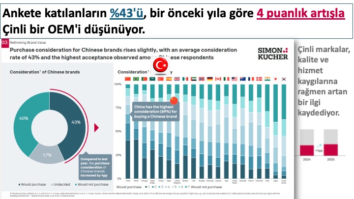 📌%43: Marka sadakati zayıflıyor. 10 kişiden 4’ü artık Çinli üreticileri (BYD, Chery, MG, NIO vb.) ciddi bir alternatif olarak görüyor.
