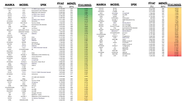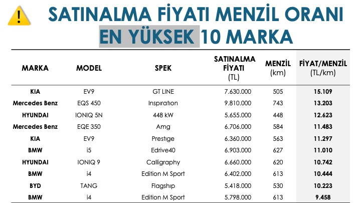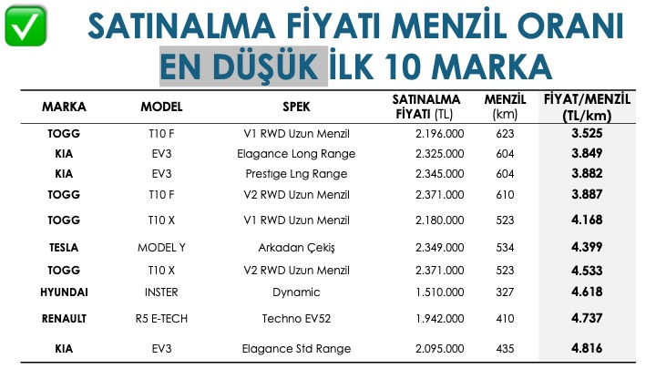 ▪️ “1 km menzil için ödenen satın alma bedeli” hangi markalarda avantajlı?